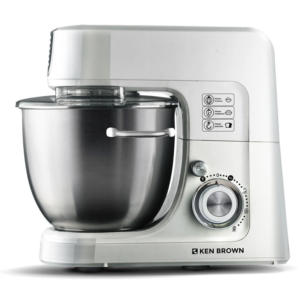Potencia y precisión para tus recetas. Con 800 Watts, movimiento planetario y 10 niveles de velocidad + Función TURBO, la batidora planetaria Ken Brown KH-791 garantiza mezclas homogéneas y un amasado perfecto. Su bowl de acero inoxidable de 4,5 Litros con asas y tapa roja, junto con su cabezal rebatible, facilitan su uso. Incluye batidor de alambre, plano y gancho amasador para mayor versatilidad.
