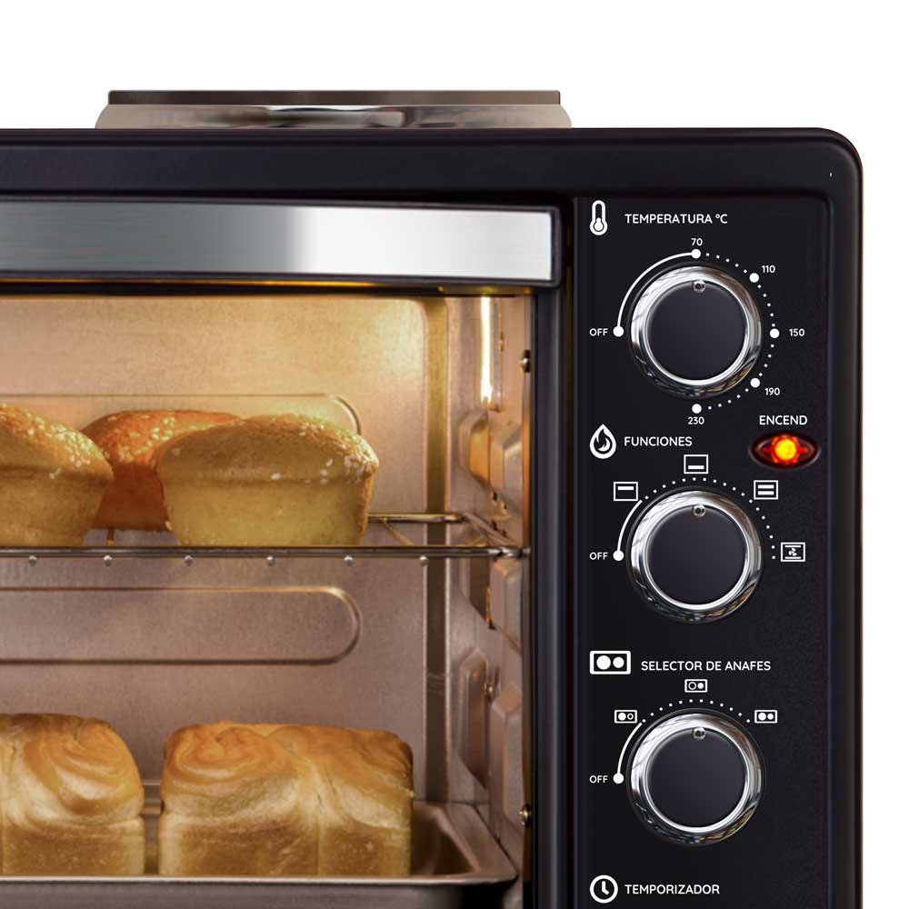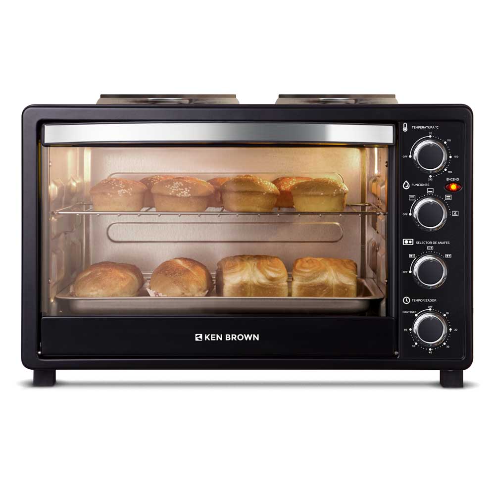 Más espacio, más posibilidades. El Horno Eléctrico Ken Brown KB-4332 de 43 litros con doble anafe superior y función de convección garantiza una cocción homogénea y eficiente. Con 1600 Watts de potencia, termostato ajustable y apagado automático, es la opción perfecta para quienes buscan eficiencia y versatilidad en la cocina.